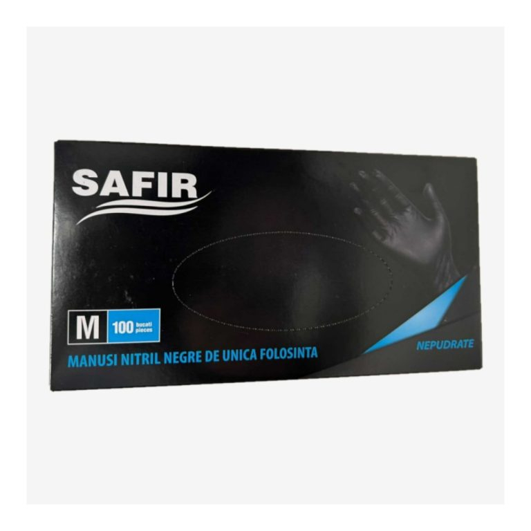 Mănuși nitril negre SAFIR, nepudrate, 100 buc/set. Igienice și rezistente, ideale pentru manipulare alimente, curățenie și activități profesionale.