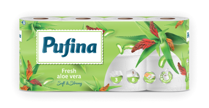 Hârtie igienică Pufina Fresh Aloe Vera cu 3 straturi extra fine, realizată din 100% celuloză, pentru confort și igienă zilnică. Produsul este testat dermatologic, potrivit pentru pielea delicată și oferă o senzație plăcută de prospețime datorită parfumului subtil de aloe vera aplicat pe tubul rolei. Ambalajul este 100% reciclabil, contribuind la protejarea mediului.